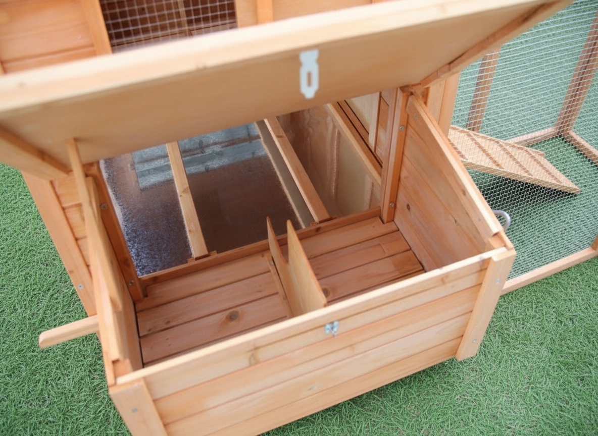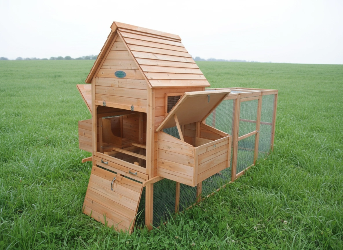 Wyposażenie: dwa gniazda, dwa poziomy, wybieg, praktyczne drzwiczki i okienka wentylacyjne