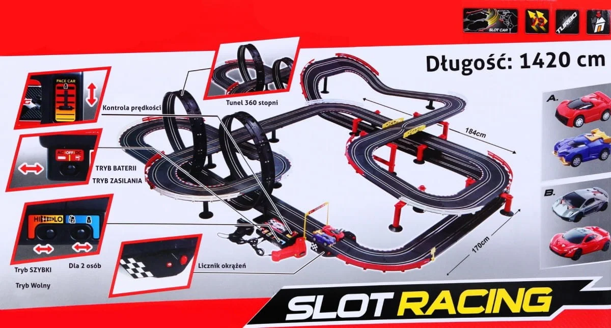 | | - tor ok. 184 cm x 170 cm, - długość przejazdu ok. 1420 cm, - pilot ok. 15 cm x 9 cm, - autko ok. 11 cm x 4,5 cm x 2,5 cm, - opakowanie ok. 47 cm x 22 cm x 25 cm. |