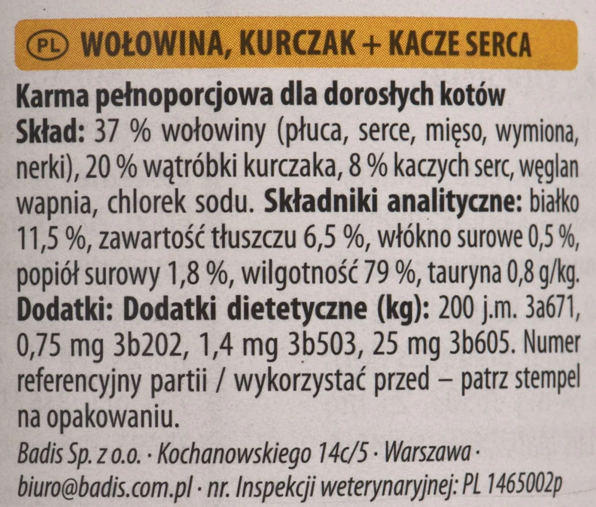 Bez soi: TakBiałko: 11,5%Brak sztucznych barwników: TakEAN: 4017721837224Gwarancja: Brak gwarancjiIlość: 1Pojemność: 400 gPopiół surowy: 1,8%Rodzaj dozownika: PuszkaSmak karmy: Kurczak, Kaczka, WołowinaWiek zwierzęcia: DorosłyWłókna surowe: 0,5%Zawartość tłuszczu: 6,5%Zawartość wilgoci: 79%Zawiera witaminy: Witamina D3, Witamina E.