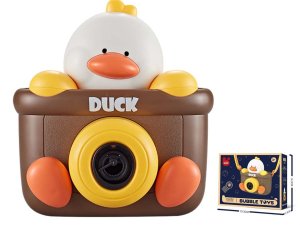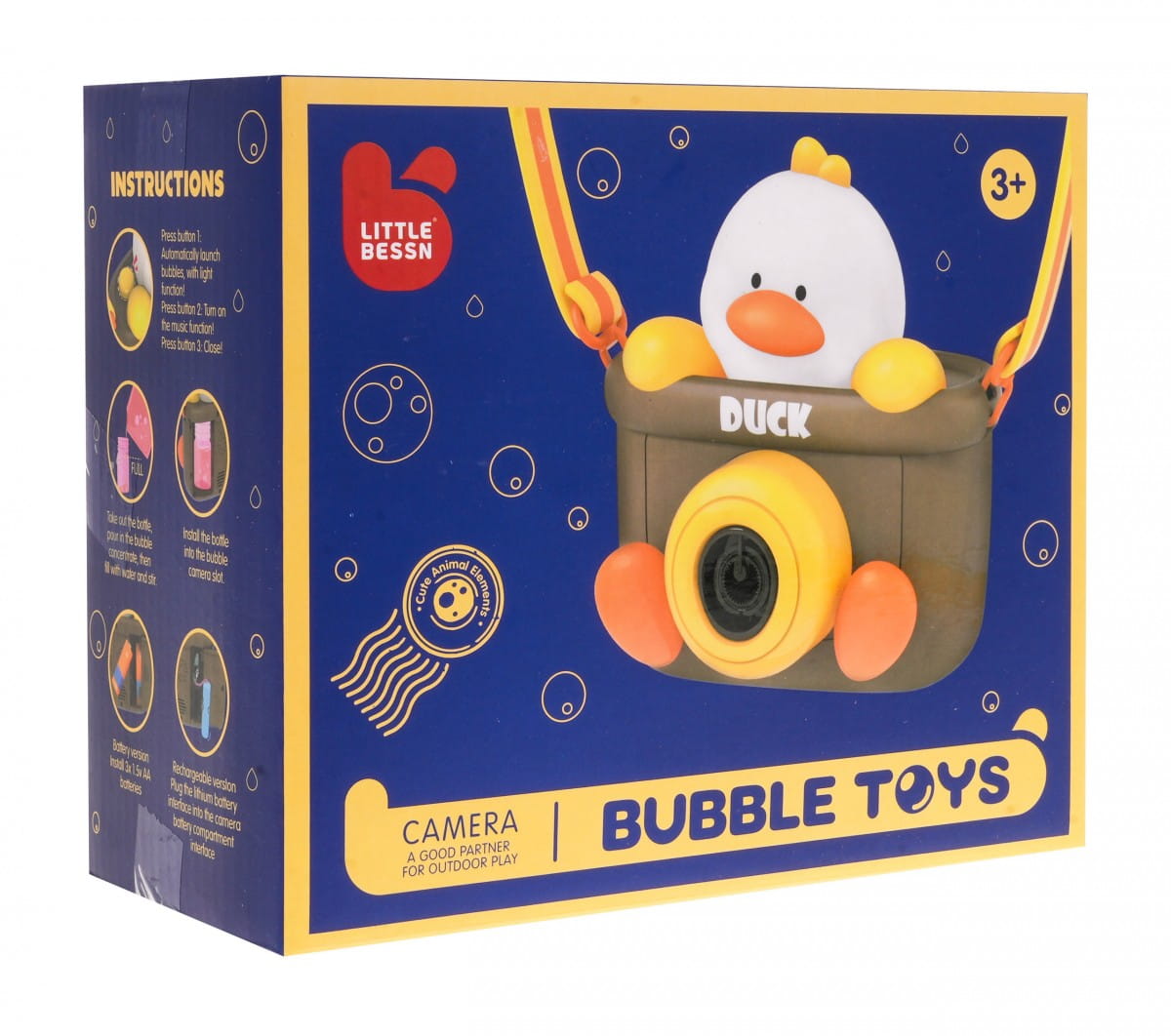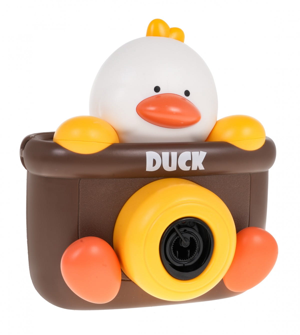 Opis Aparat Do Robienia Baniek Kaczuszka Interaktywna maszynka do robienia baniek mydlanych przypominająca wyglądem aparat fotograficzny w kształcie kaczki to propozycja dla dzieci od 3-go roku życia. Zabawka jest prosta w użyciu, wystarczy uzupełnić ją płynem do baniek mydlanych, dołączonym do zestawu oraz zainstalować baterie.