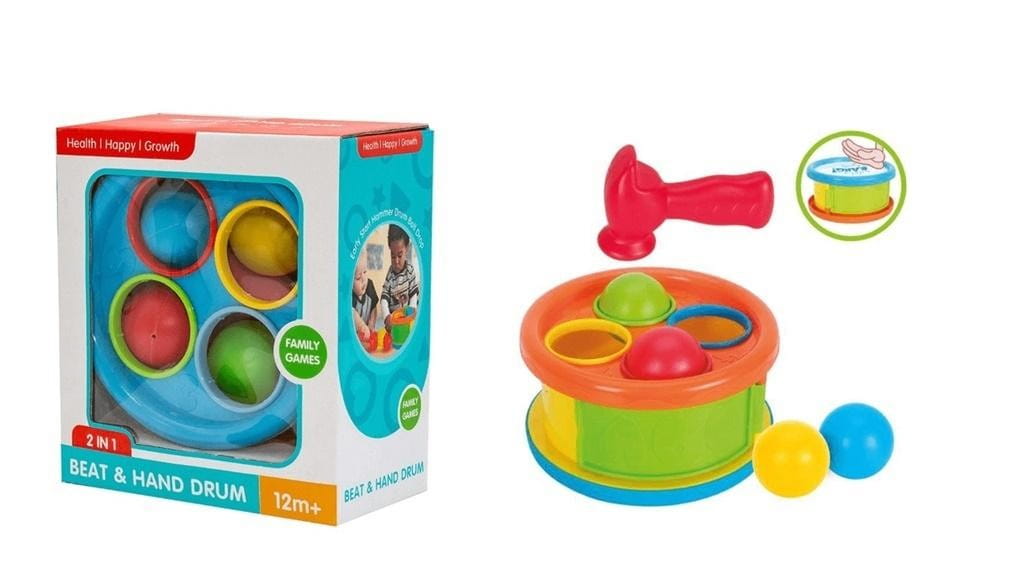 Zabawka z jednej strony posiada otwory w takich samych kolorach jak piłeczki, które należy wbić do środka plastikowym młotkiem.Druga strona oferuje muzyczną zabawę z bębenkiem.