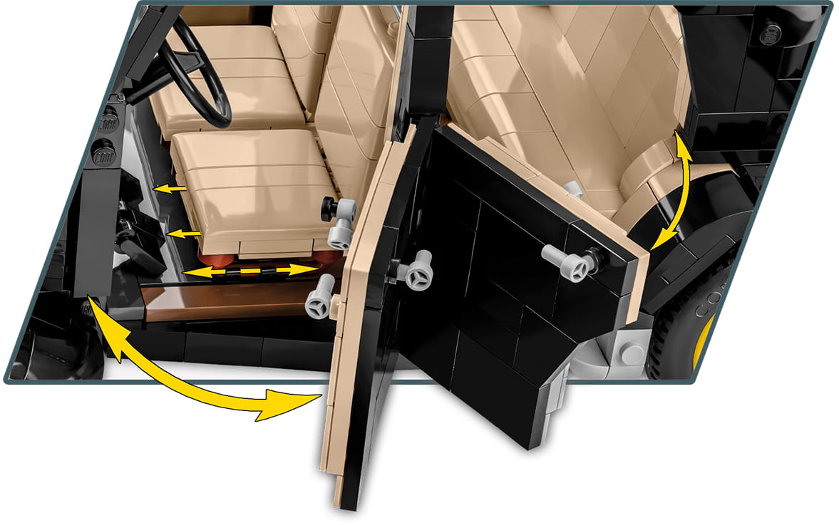 Zestaw zawierający się z ponad 1700 elementów to nie tylko samochód z obracającymi się kołami, otwieranymi drzwiami, ale również działająca kierownica i skrętne koła, uchylna maska, otwierany bagażnik, odwzorowany wygląd silnika oraz odtworzone z klocków liczne detale wnętrza samochodu.