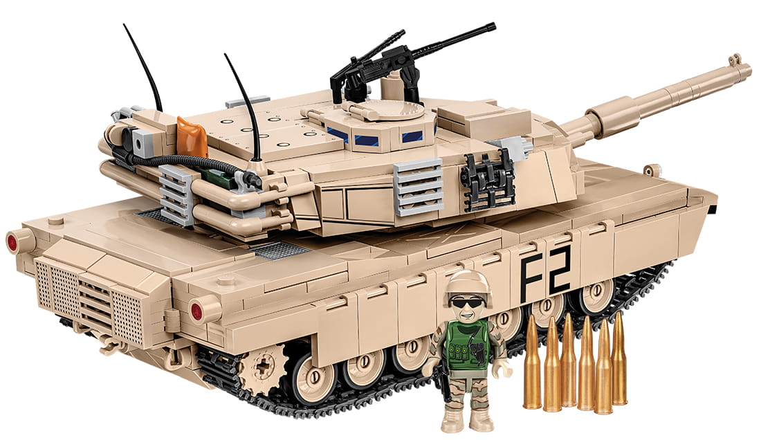 Z zestawu klocków konstrukcyjnych COBI wybudujesz czołg Abrams w wersji M1A2 opracowany na licencji General Dynamics Land Systems. Model został odwzorowany w rewelacyjnej skali 1:35. Najnowsza wersja tego topowego czołgu to jeszcze bardziej szczegółowo odwzorowane detale. Stało się to możliwe dzięki zastosowaniu nowych klocków ze wciąż rosnącego katalogu elementów, które tworzy firma COBI. Na modelu znajdują się wyłącznie wysokiej jakości nadruki, które nie ścierają się podczas użytkowania. Pojazd posiada działający gąsienicowy układ bieżny oraz otwierane włazy, w których umieścisz załogantów. Wieża pojazdu i lufa są ruchome. Pod zdejmowaną klapą serwisową znajduje się odwzorowany z klocków silnik. Czołg Abrams został wzbogacony o dodatki takie jak: klockowy worek, zapasowe gąsienice, amunicję oraz dwa karabiny maszynowe. Otwierana klapa umożliwia dostęp do odtworzonego z klocków silnika. Do zestawu dołączona jest bardzo ciekawa figurka amerykańskiego czołgisty wyposażona w pistolet osobisty.