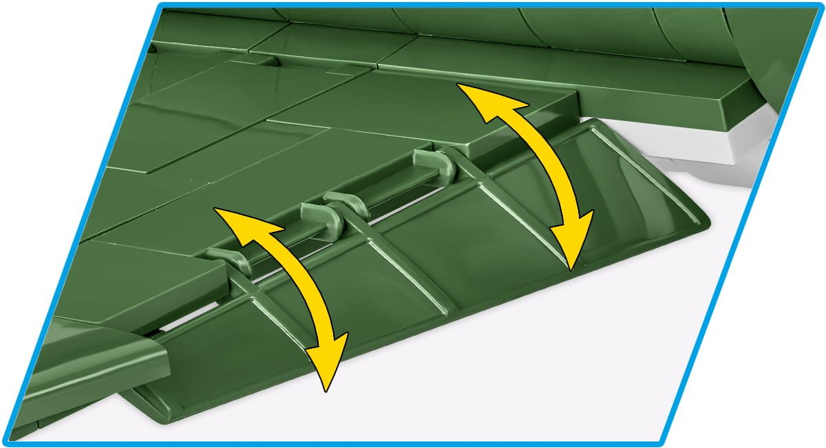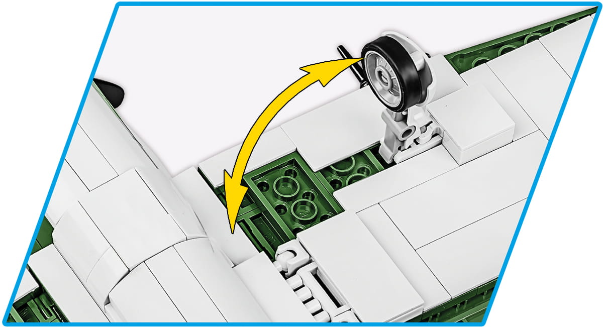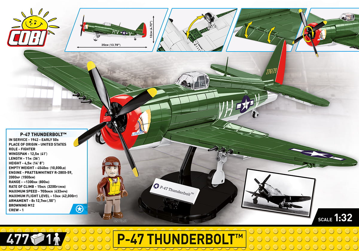 Klockowy P-47 został opracowany w pasującej do reszty kolekcji skali 1:32 przy zastosowaniu 477 klocków konstrukcyjnych COBI. Model zawiera wysokiej jakości nadruki, które nie ścierają się w trakcie użytkowania. Za ich pomocą odtworzono historyczne malowanie “Little Chief” oraz inne detale samolotu. Model posiada wiele ruchomych elementów takich jak obrotowe koła z gumowymi oponami, ruchome śmigło i lotki. W kabinie możemy umieścić dołączoną do zestawu figurkę pilota! To świetny model dla wszystkich pasjonatów historii, lotnictwa i kolekcjonerów. Całość zestawu uzupełnia klockowa podstawka ekspozycyjna oraz klocek z nadrukowaną nazwą modelu.