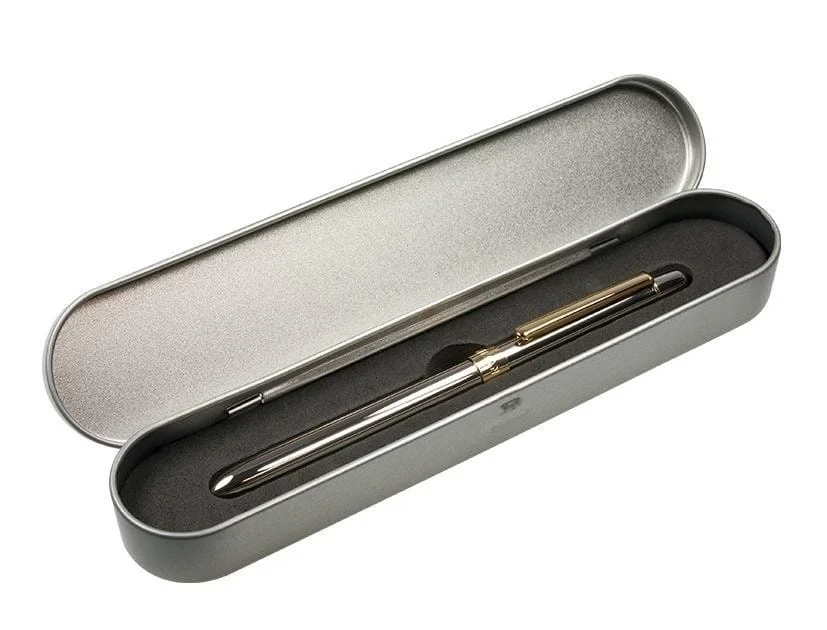 Pióro z 4 cechami: niebieski długopis 0,7 mm, czerwony długopis 0,7 mm, ołówek mechaniczny HB 0,5 mm i gumka MILAN. Chromowana srebrna lufa, centralny detal pierścienia z wytłoczonym logo MILAN i złotym klipsem.