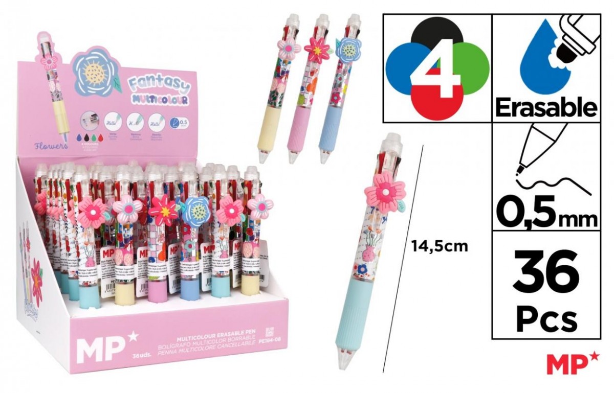 Długopis ścieralny 4-kolorowy Kwiaty (36szt)EAN: 18435721012411Opakowanie: pudełkoProducent: MP Main Paper.