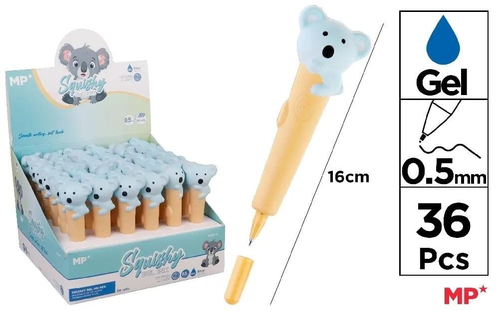 Dekompresyjny długopis z miękkim piankowym korpusem.Niebieski żelowy tusz o dużej miękkości ipłynności podczas pisania. Końcówka 0,5 mm. Rozmiar160 mm. 36 sztuk z małą kaczką.