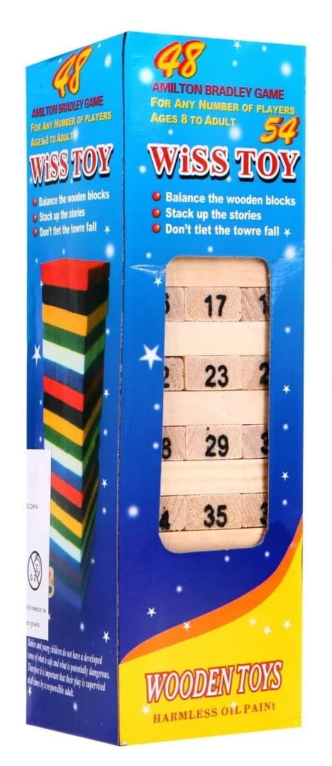 | 1. Wariant pierwszy: zadaniem graczy jest naprzemienne wyciąganie po jednym klocku z dowolnego piętra wieży, który umieszczają następnie na szczycie wieży. W tym wariancie, nie używamy kostek do gry. 2. Wariant drugi: rzucając 4 kostki sumujemy liczby i wyciągamy klocek z liczbą jaką wyrzuciliśmy za pomocą kostek. Właściwy klocek umieszczamy następnie na szczycie wieży.Przy każdej operacji należy uważać, by nie zniszczyć całej konstrukcji. Pamiętajmy również, że przy każdym wyjętym i przemieszczonym klocku zadanie staje się coraz trudniejsze, a gra coraz bardziej emocjonująca. Wieża może jednak utrzymać równowagę nawet przy dwukrotnym zwiększeniu swojej wysokości. Ilość graczy: dowolna. | |