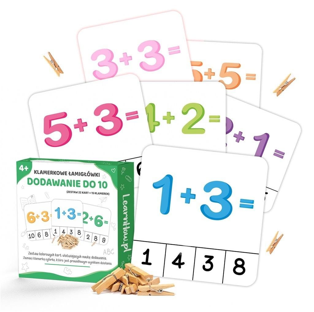 Zestaw składa się z 22 kart oraz 15 klamerek. Zadanie polega na oznaczaniu przy pomocy klamerek poprawnego wyniku dodawania umieszczonego na karcie.