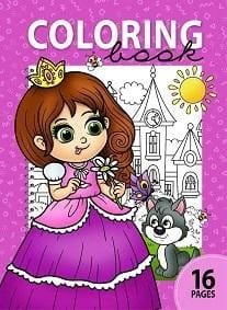 Kolorowanka dla dzieci z obrazkami księżniczek. W środku znajduje się 16 obrazków.