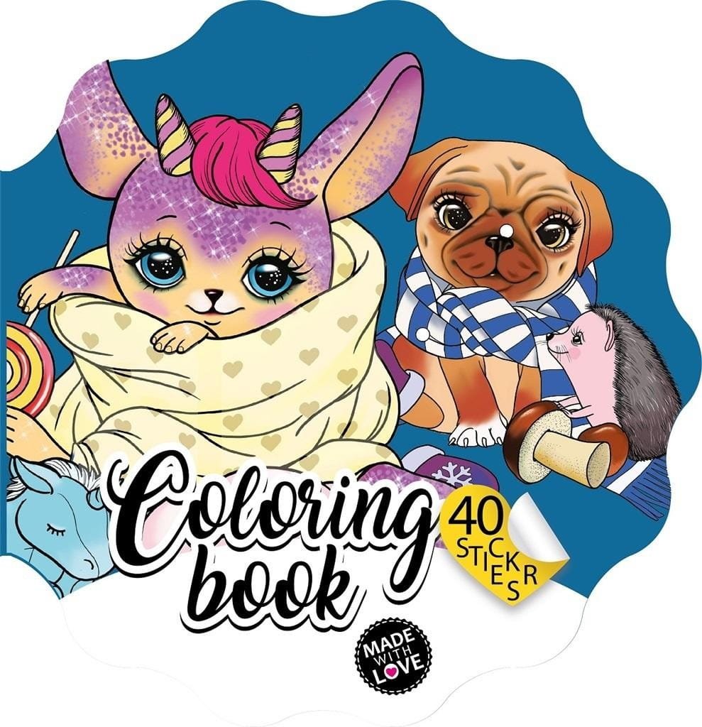 Kolorowanka dla dzieci w kształcie kwiatka, z magicznymi zwierzątkami. W zestawie 40 naklejek. Wyprodukowano na Ukrainie.