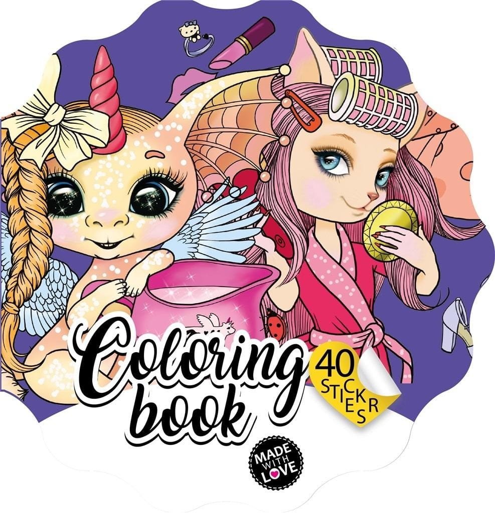 Kolorowanka dla dzieci w kształcie kwiatka, z magicznymi zwierzątkami. W zestawie 40 naklejek. Wyprodukowano na Ukrainie.