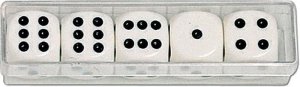 Zestaw 5 dużych kości (22 mm) w przezroczystym etui. Dołączona instrukcja do gry w kości oczkowe w języku polskim.