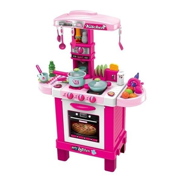 Duża kuchnia dziecięca z światłami i realistycznymi dźwiękami sprawi, że Twoja mała dziewczynka stanie się prawdziwą gospodynią domową. Wykonana jest z wysokiej jakości tworzywa sztucznego. Zasilana trzema bateriami 1,5 V AA. Opakowanie nie zawiera baterii. Przeznaczona dla dzieci od 3 lat. Kuchnia zawiera - 1 piekarnik, który się otwiera - 1 toster - 2 palniki, które zapalają się i wydają dźwięki, pokrętła - 1 zlew z kranem - 1 okap z haczykami do zawieszania naczyń - 2 półki z boku kuchni - 1 taca ociekowa Akcesoria: - 2 garnki z pokrywkami - 2 chochle - 1 obracacz - sztućce - 1 nóż - 2 kubki - 4 talerze - 1 keczup - 1 solniczka - 1 mleko - 1 sok pomarańczowy - 5 rodzajów warzyw - 1 tost Zabawka jest odpowiednia dla dzieci od 3 lat. Baterie (3xAA) nie są dołączone. Materiał: plastik. Wymiary: wys. X szer. X gł .: ok. 87x64x29 cm.