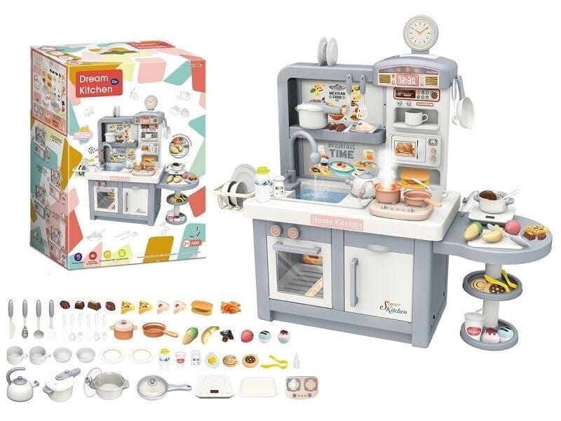 Kuchnia z funkcją pary z akcesoriamiW zestawie: kuchnia ze zlewem i piekarnikiem 2-palnikowa kuchenka suszarka podręczny stolik garnki kubki talerze sztućce artykuły spożywcze akcesoria Funkcje: po nalaniu wody do zlewu i naciśnięciu pompki z kranu leci woda palnik z efektem pary EAN: 6927220120087Grupa wiekowa: 3+Opakowanie: pudełkoProducent: IcomWymiary: 670x490 mm.