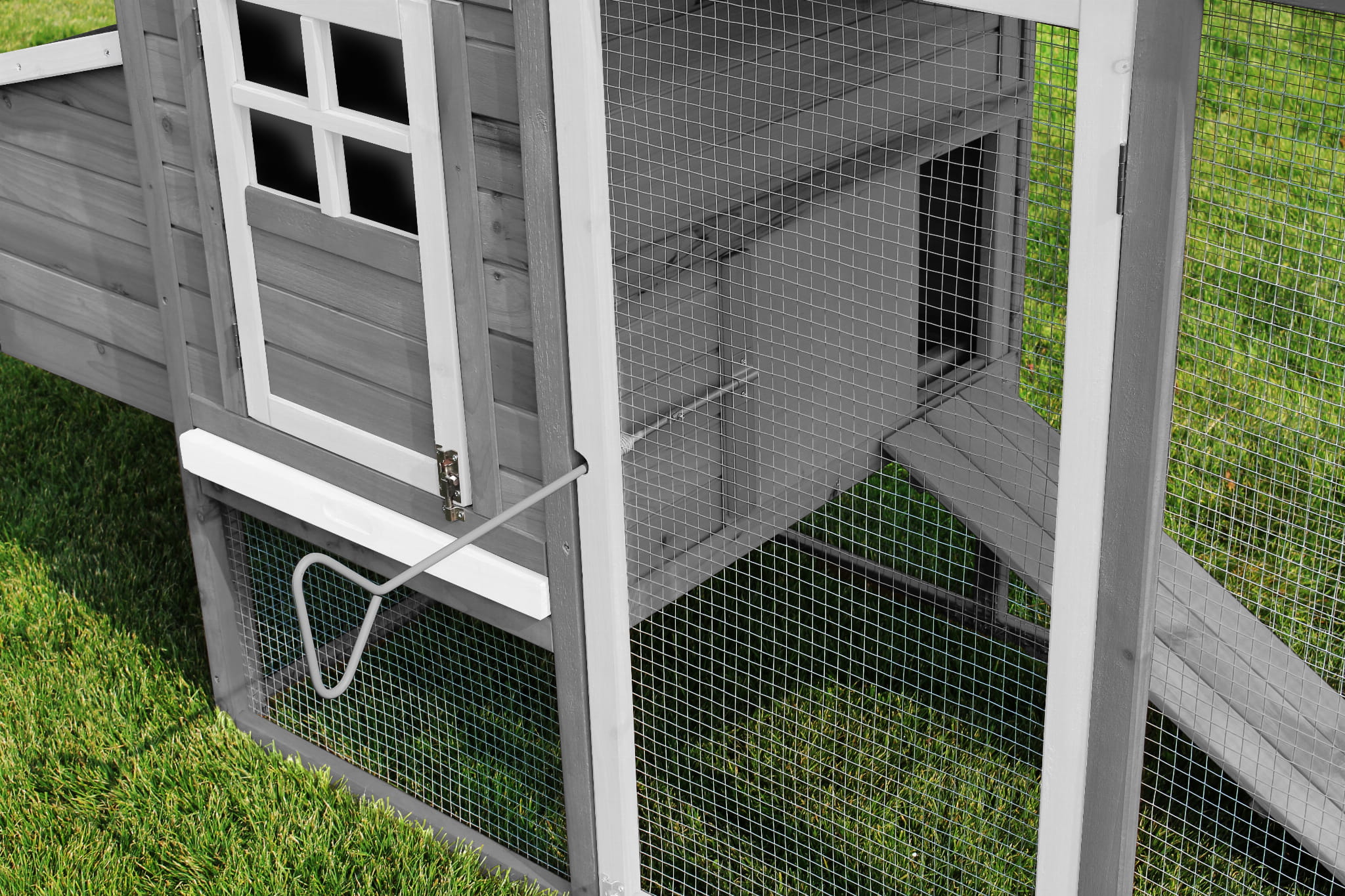 Na górnym poziomie znajduje się gniazdo niosek o wymiarach 51,5 x 25 x 24 cm z dwoma grzędami. Poniżej dwukondygnacyjny kurnik oferuje odpowiedni dla gatunku kontakt z podłożem na całym obszarze i umożliwia naturalne zachowanie, takie jak dziobanie i drapanie.