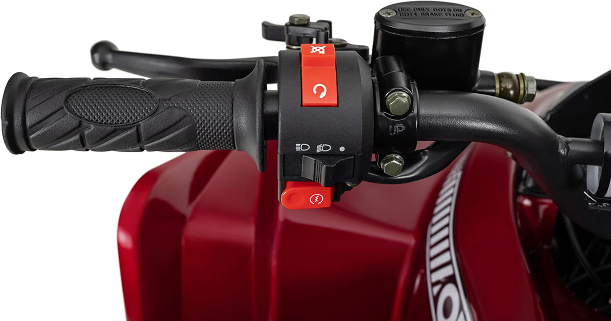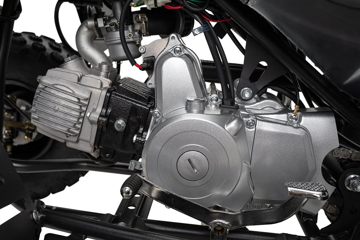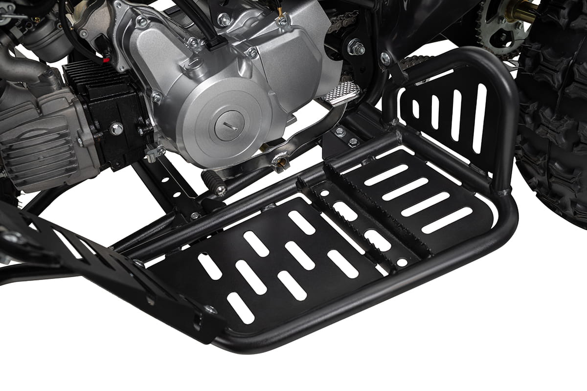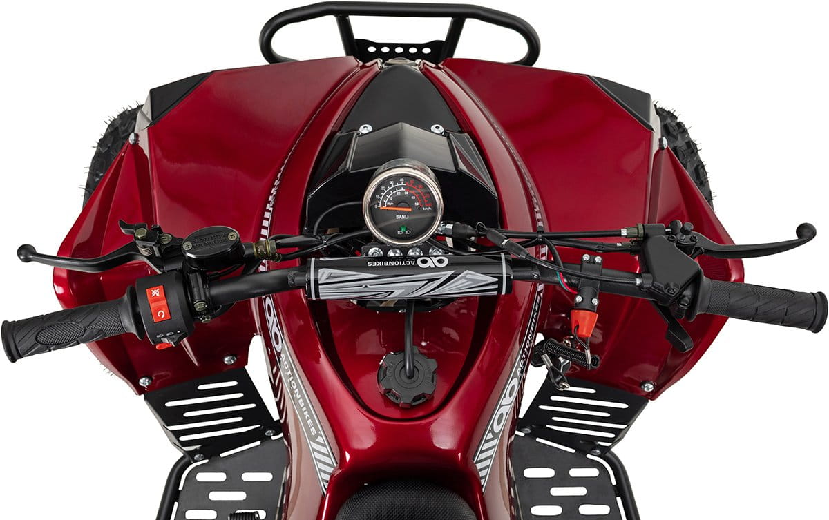 Hydrauliczny hamulec tarczowy z tyłu i dwa hamulce bębnowe z przodu zapewniają dodatkowe bezpieczeństwo podczas jazdy. Również 8-calowe opony o dobrej przyczepności do drogi mają szczególnie dobre właściwości hamowania. Pilot dostarczany w standardzie zapewnia również maksymalne bezpieczeństwo jazdy: maluchom można interweniować zdalnie za pośrednictwem radia, a quad można całkowicie zatrzymać. Przednie reflektory i tylne światła zapewniają dobrą widoczność. W tym modelu niezbędna jest również odpowiednia odzież ochronna.Proszę zanotować!
