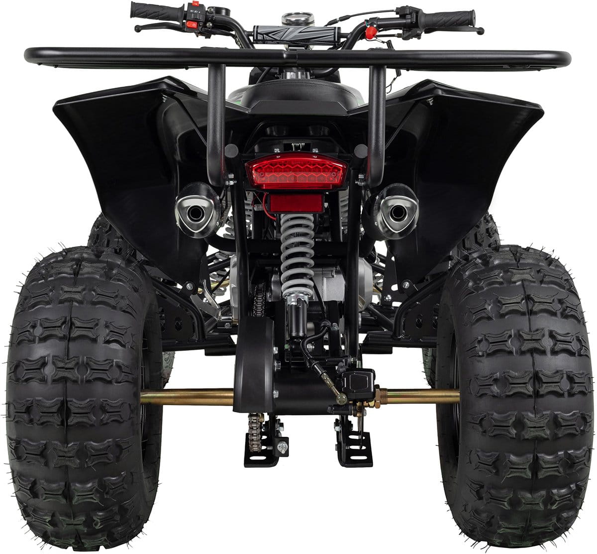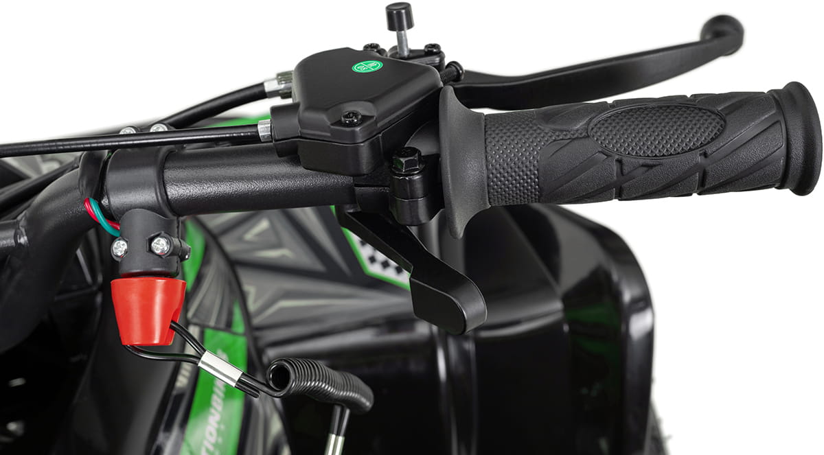Hydrauliczny hamulec tarczowy z tyłu i dwa hamulce bębnowe z przodu zapewniają dodatkowe bezpieczeństwo podczas jazdy. Również 8-calowe opony o dobrej przyczepności do drogi mają szczególnie dobre właściwości hamowania. Pilot dostarczany w standardzie zapewnia również maksymalne bezpieczeństwo jazdy: maluchom można interweniować zdalnie za pośrednictwem radia, a quad można całkowicie zatrzymać. Przednie reflektory i tylne światła zapewniają dobrą widoczność. W tym modelu niezbędna jest również odpowiednia odzież ochronna.Proszę zanotować!