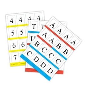 Zestaw kartoników z wielkimi i małymi literami drukowanymi z kolorystycznym oznaczeniem samogłosek i spółgłosek oraz liczbami 1-10 i znakami matematycznymi. Doskonała pomoc w utrwalaniu znajomości liter.