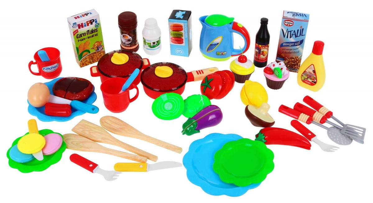 | - kuchnia, - naklejki, - dotykowy panel, - kran na pompkę, - suszarka na talerze, - boczne półeczki, - zegar (ok. 6 cm x 6 cm), - 5 x haczyki do zawieszania sztućców, - czajnik z otwieranym wieczkiem (ok. 9 cm x 11 cm) - 6 x warzywa na rzepy (grzyb, papryka, bakłażan, cytryna, kapusta, pomidor), - owoce (kiwi, wisienka, truskawka), - garnek z pokrywą (ok. 6 cm x 13 cm) i patelnia z pokrywką (ok. 5 cm x 17 cm), - 4 talerze (2 duże – średnica ok. 14 cm i 2 małe – średnica ok. 10 cm), - 2 filiżanki (ok. 5 cm x 7 cm), - 4 x szpatułka (ok. 16 cm x 3 cm), - chochla, cedzak, łyżka (ok. 14 cm x 2,5 cm), - sztućce (2 małe łyżeczki, 2 małe noże, duży nóż, 2 widelce – ok. 10 cm x 1,5 cm), - imitacja jedzenia (parówki, jajko), - 3 kartoniki z produktami, - 2 muffinki z dodatkami - 4 ciasteczka, - imitacja opakowania z kawą, majonezem, mlekiem, - buteleczka czarna. | |