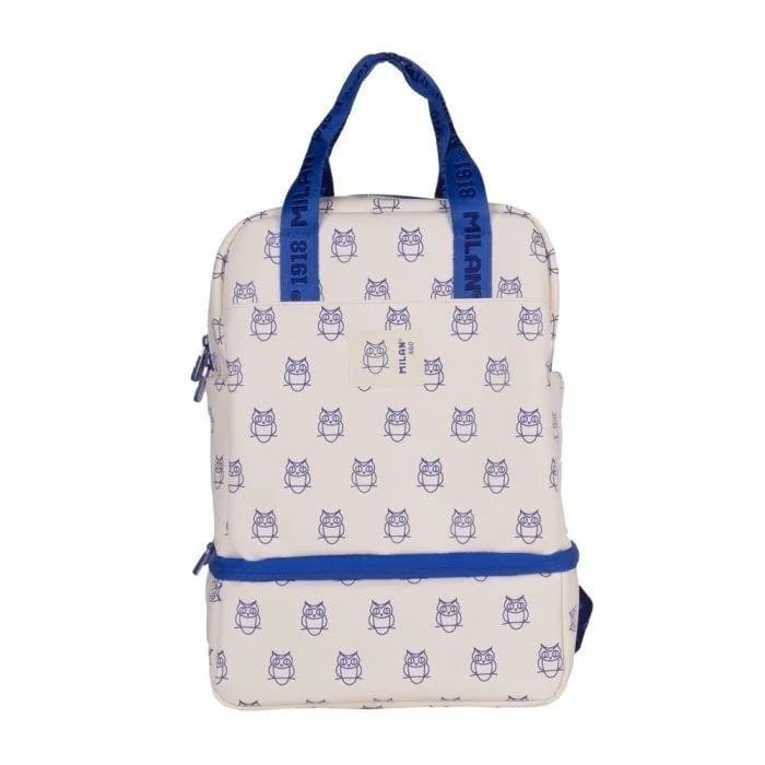 Plecak szkolny, prostokątny z dolną komorą izolowaną termicznie (zimno/ciepło) dla lepszego przechowywania żywności, o pojemności 2 l. Kolor beżowy z granatowym wzorem sowy. Kolekcja 460 inspirowana oryginalnymi kolorami i wzornictwem gumek MILAN, produkowanych w Hiszpanii od 1918 roku. Zapięcie na zamek błyskawiczny. Duża komora wewnętrzna i dwie kieszenie boczne na butelki lub małe przedmioty. Regulowane paski na ramię, regulowane paski z przodu i uchwyty do przenoszenia w jaskrawym niebieskim kolorze. Niebieska wzorzysta podszewka wewnętrzna. Skład materiału zewnętrznego: 100% poliuretan. Skład wewnętrznej podszewki: 100% poliester (duża komora wewnętrzna) i P.E.V.A. (komora dolna). Wymiary: 33 x 25 x 13 cm. Pojemność: 13,5 l.