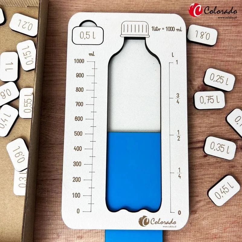 Butelka posiada możliwość napełnienia wodą. Zadaniem dziecka jest nalanie odpowiedniej ilości wody do butelki, odczytanie pojemności w mililitrach i dopasowanie odpowiedniego puzzla z daną pojemnością w litrach (zamiana jednostek).
