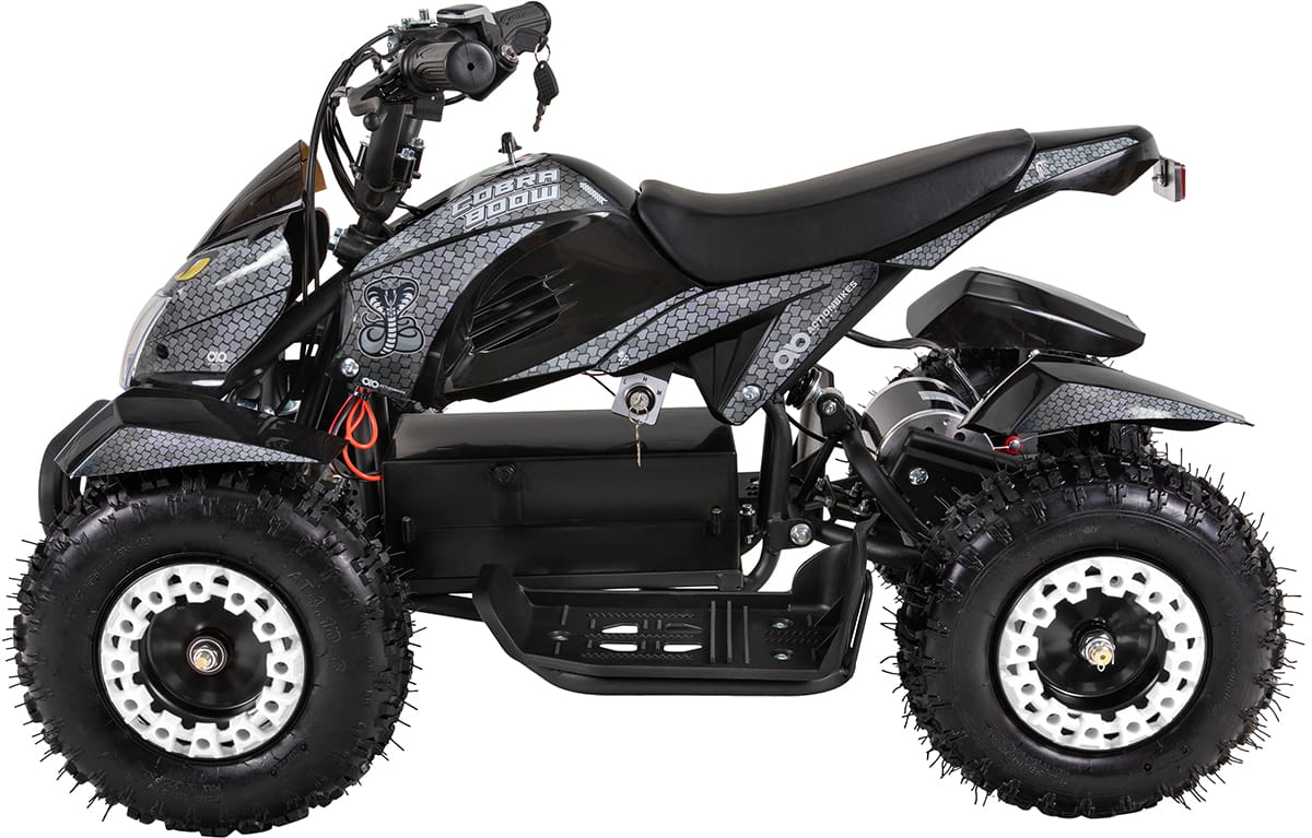 Dzięki elektrycznemu quadowi dla dzieci Cobra możesz zapewnić swoim dzieciom niezwykłe przeżycia i niesamowitą zabawę . Szeroki uśmiech na twarzach małych kierowców jest po prostu bezcenny. Ten elektryczny quad dla dzieci nie bez powodu nazywany jest „Kobrą” . Bo kipi siłą . Za małą i kompaktową konstrukcją kryje się duża moc . Dzięki silnikowi elektrycznemu o mocy 800 W możliwa jest prędkość do 30 km/h . Dzięki niskiej wysokości siedziska mini quad jest idealny dla dzieci w wieku pięciu lat i starszychodpowiedni. Wysokiej jakości hamulce tarczowe, jasne oświetlenie i wiele więcej zapewniają niezbędny poziom bezpieczeństwa . Unikalny wzór wężowy robi ogromne wrażenie. Dzięki temu mali zawodnicy mają zawsze gwarancję świetnego wyglądu!