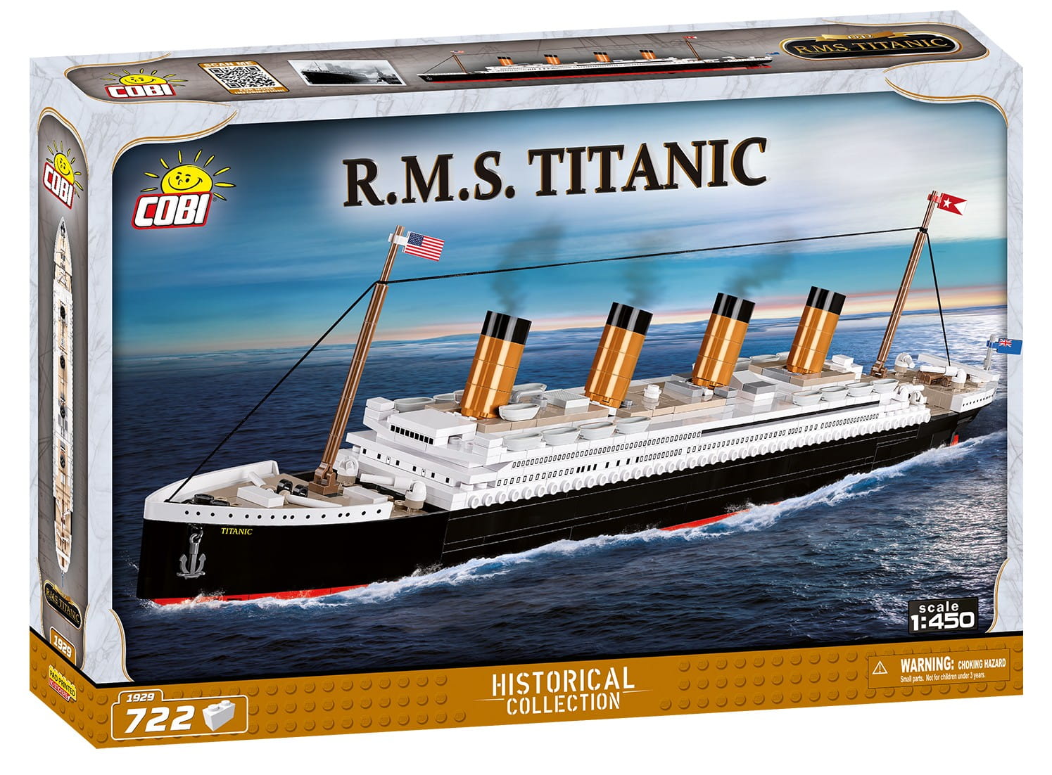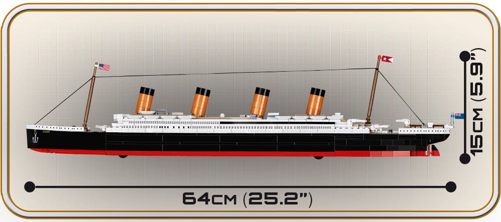 Klockowy model okrętu składa się z 722 klocków konstrukcyjnych COBI. Po zbudowaniu ma aż 64 cm długości i 15 cm wysokości. Liczne detale odtwarzają skalę 1:450 i wiernie odwzorowują kształt i bryłę swojego legendarnego pierwowzoru. Zestaw zawiera ruchome elementy. Ta edycja została wyposażona w obrotowe kółka montowane w płaskim dnie okrętu. Za ich pomocą okręt może "pływać" na płaskich powierzchniach takich jak podłoga, dywan czy stół. Dzięki takiemu rozwiązaniu model kolekcjonerski staje się również zabawką. Można również poruszać dźwigami, śrubami i sterem. W instrukcji zastosowano system prostych ikon i piktogramów, które z łatwością przeprowadzą Cię przez proces budowy. Klockowy model Titanica nie wymaga sklejania ani malowania. Wszystkie grafiki i napisy są naniesione na klocki w formie bardzo trwałych nadruków, które nie ścierają się ani nie bledną pod wpływem słońca, wody czy nawet bardzo intensywnej zabawy. W modelu nie użyto żadnych naklejek. Zestaw dedykowany jest dla osób powyżej 8 roku życia. Z pewnością sprawi wiele satysfakcji zarówno najmłodszym fanom klocków, jak i dorosłym pasjonatom historii i marynistyki. Model okrętu R.M.S Titanic z pewnością będzie spektakularnie się prezentował zarówno na biurku kolekcjonera, jak i w pokoju każdego nastolatka i dziecka.