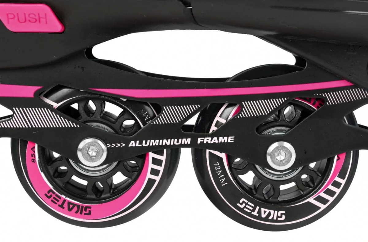 | Buty | - 5 stopniowy system regulacji rozmiaru za pomocą przycisku (39-43) - wewnętrzna długość buta od 24 cm do 27,5 cm, - półtwarda konstrukcja zapewniająca elastyczność buta i bezpieczeństwo kostki - zapięcie trzy sekwencyjne: - sznurowadła - pasek na rzep - klamra (regulacja + zabezpieczenie przed otwarciem) - hamulec w prawej rolce - system wentylacji - półprzepuszczalna membrana - wkładka profilowana - wkładka rolki wypełniona miękką pianką EVA pokryta zewnętrzna warstwą materiału Velvet |