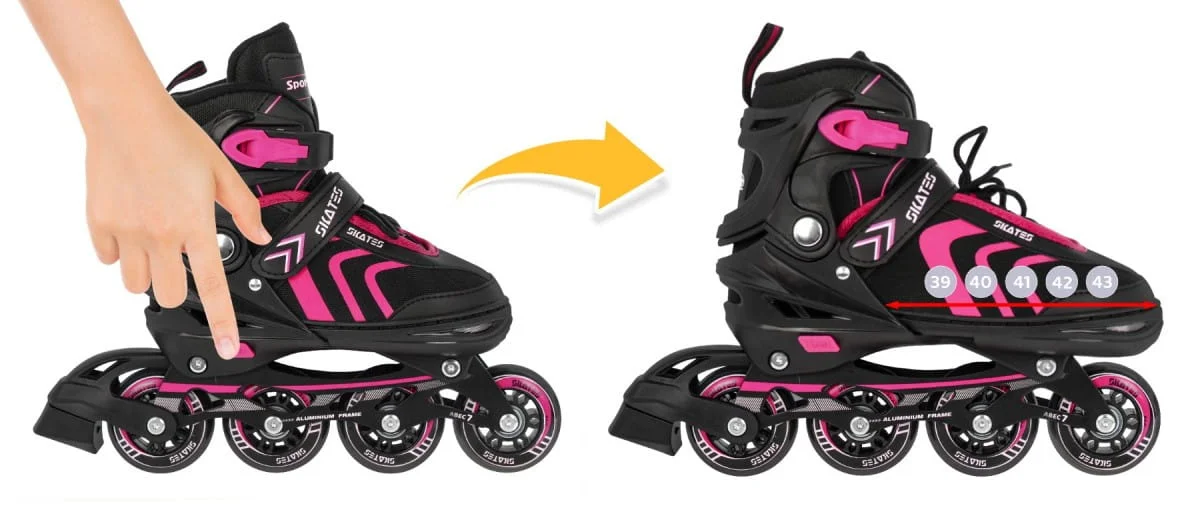 SpecyfikacjaRolki, Łyżwy, Zestaw 4w1Buty- 5 stopniowy system regulacji rozmiaru za pomocą przycisku (39-43)- wewnętrzna długość buta od 24 cm do 27,5 cm, - półtwarda konstrukcja zapewniająca elastyczność buta i bezpieczeństwo kostki- zapięcie trzy sekwencyjne: - sznurowadła - pasek na rzep - klamra (regulacja + zabezpieczenie przed otwarciem)- hamulec w prawej rolce- system wentylacji- półprzepuszczalna membrana- wkładka profilowana- wkładka rolki wypełniona miękką pianką EVA pokryta zewnętrzna warstwą materiału VelvetTrack (płoza)- kółka wykonane z PU, 72x24 mm- twardość 85A- łożyska ABEC-7- track (płoza rolki) aluminiowy- płozy łyżew ze stali nierdzewnejZawartość zestawu- buty- tracki rolek- płozy łyżew- osłona na łyżwy- klucze montażowe EAN: 5903864952995.