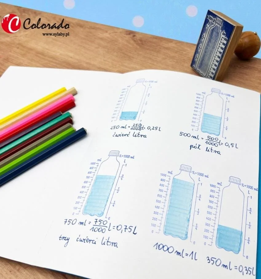 dziecko koloruje odbitą przez stempel butelkę do odpowiedniej pojemności i zapisuje tą wartość w mililitrach i przelicza na litry (zamiana jednostek),