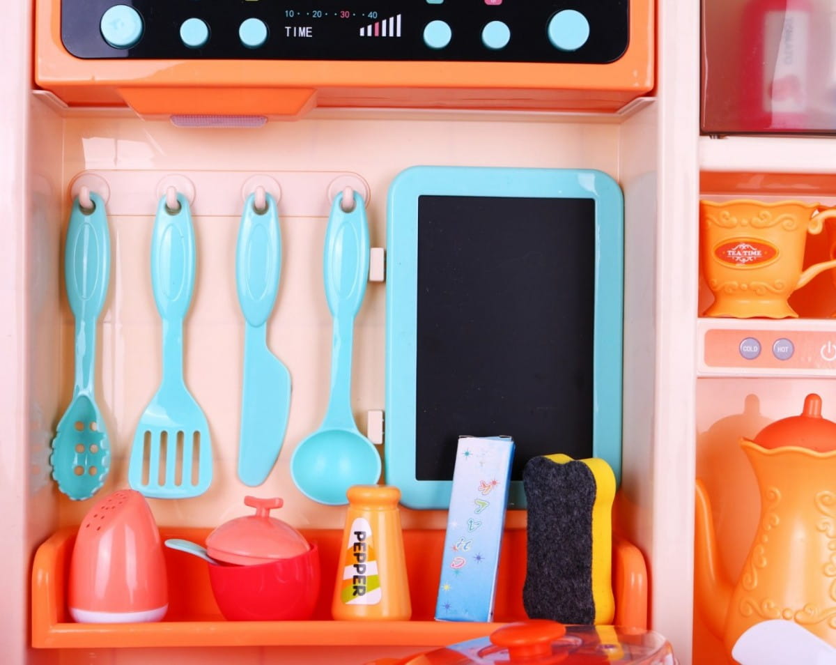 | | Rewelacyjna, bogato wyposażona, duża multifunkcyjna kuchnia. Kuchnia posiada zlew z kranem z którego leje się woda, podświetlane palniki z odgłosami gotowania i smażenia, jeden z palników posiada funkcję wytwarzania pary wodnej, ruchome pokrętła, okap z lampką i panelem muzycznym, otwierany piekarnik, otwieraną lodówkę, zegar, półeczki i liczne akcesoria kuchenne (65 elementów). W akcesoriach kuchennych znajduje się min. jajowar, który „gotuje” jajka, wydając przy tym dźwięki oraz tablica z kredą i gąbką. Zestaw przeznaczony jest dla dzieci od 3-go roku życia i zasilany jest bateriami typu 8 x AA, które nie są dołączone do zestawu. |