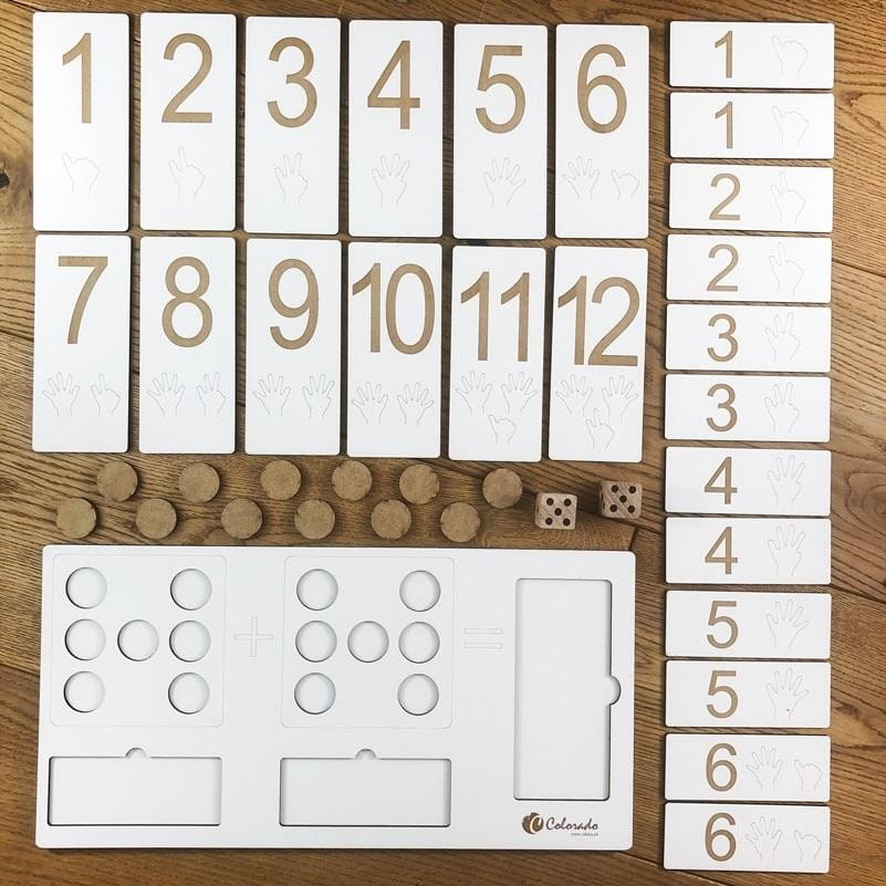 Zestaw do nauki cyfr i dodawania do 12 w formie zabawowej.