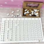 Zestaw zawiera 103 elementy (tabliczkę mnożenia, 100 elementów z liczbami, dwie kostki z cyframi od 1 do 10).