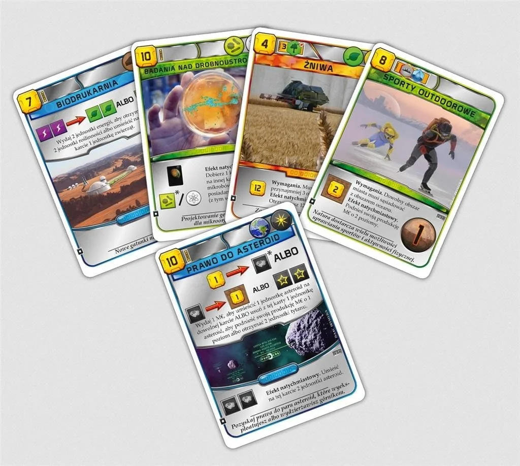 Terraformacja Marsa - Zestaw dodatkowy #6Zwiększ swoje możliwości inwestowania w wielkoskalowe projekty kosmiczne dzięki Prawu do asteroid! Ta dodatkowa karta dobrana i zagrana w odpowiednim momencie może zapewnić Ci nie lada przewagę, zapewniając stały dostęp do jednostek tytanu lub możliwość zwiększania produkcji kredytów. Niezależnie czy dążysz do zdobycia nagrody Bankiera, czy masz w planach śmiałe (i drogie) inwestycje w projekty z symbolem przestrzeni kosmicznej, warto zwrócić na nią uwagę!Terraformacja Marsa - Zestaw dodatkowy #7Bądź na bieżąco z najnowszymi projektami wspierającymi marsjańską kolonizację i zainwestuj w nie cenne kredyty Twojej korporacji! W tym zestawie znajdziesz 4 karty projektów, które możesz dołączyć do talii podstawowej w swojej Terraformacji Marsa:Badania nad drobnoustrojami, które pozwolą Ci połączyć naukowe inwestycje z pozyskiwaniem materiału biologicznego.