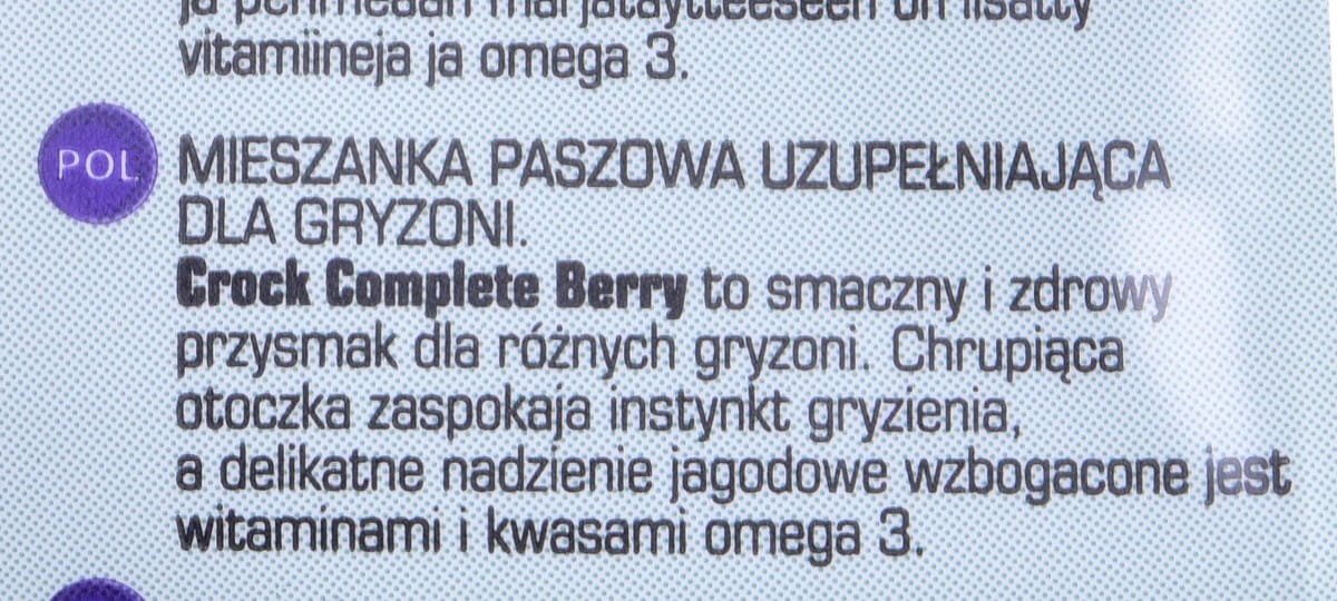BEZ CUKRU: Brak danychBez konserwantów: TakBEZ LAKTOZY: TakBez soi: Brak danychBezglutenowe: NieBrak sztucznych barwników: TakEAN: 5410340613054Efekty zdrowotne: Zdrowie ogólneForma dawkowania: StałyGwarancja: Brak gwarancjiRodzaj opakowania: SaszetkaRodzaj zwierzęcia: Gryzoń, królikSkład: produkty pochodzenia roślinnego, zboża, oleje i tłuszcze (kwasy tłuszczowe omega-3 2%), owoce (jagody 8,8%), minerałySmak karmy: JagodowySpecyficzne potrzeby zwierzęcia: Brak szczególnych potrzebWaga produktu: 50 gWiek zwierzęcia: DorosłyZawiera witaminy: Witamina C, Witamina A, Witamina D3, Witamina E.
