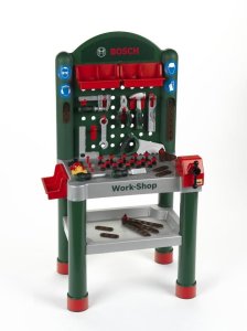 KL 8320 Warsztat Bosch 79 elementów Warsztat marki Klein pochodzi z serii zabawek Bosch mini powstałej na licencji firmy Bosch, dlatego też narzędzia wchodzące w jego skład są wiernymi kopiami faktycznie istniejących narzędzi tej marki. W zestawie zapakowanym w duży zielony karton Klein, znajdziemy aż 79 elementów konstrukcyjnych i narzędzi do zabawy.