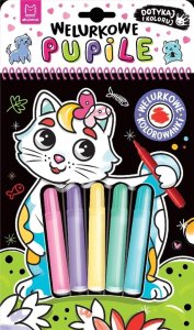 "Welurkowe pupile" to kolorowanka sensoryczna z dołączonymi pisakami. Tło obrazków pokrywa czarny welur, który podkreśla głębię kolorów, zapewnia wrażenia sensoryczne i ogranicza wychodzenie poza linię. Dzięki perforacji pokolorowaną pracę można oderwać, włożyć do ramki i podarować w prezencie lub ozdobić nią pokój. Książeczki z serii "Welurkowe kolorowanki":