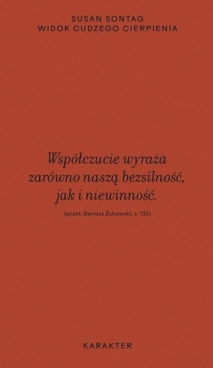 Rozwinięcie i uzupełnienie O fotografii. Autorka powraca do wielu kwestii poruszanych wcześniej, skupiając się jednak na zagadnieniu przedstawiania obrazów cierpienia w mediach, zwłaszcza w fotografii wojennej. Historyczny kontekst, w jakim powstawała książka (niedługo po ataku na World Trade Center), nie pozostał bez wpływu na charakter i temperaturę wywodu. W świecie, w którym codziennie jesteśmy zalewani potokiem obrazów pełnych okrucieństwa, w świecie po ludobójstwie w Rwandzie i po wojnie w byłej Jugosławii, a zarazem w świecie, w którym technika umożliwia prowadzenie wojny na odległość, przedstawianie obrazów cierpienia rodzi nowe pytania i problemy etyczne. Sontag bezlitośnie tropi hipokryzję Zachodu i stosowanie podwójnych standardów w pokazywaniu nieszczęścia, bólu i śmierci. Zastanawia się nad rolą fotografii w kształtowaniu tak zwanej zbiorowej pamięci i stosunku do historii. W centrum rozważań stawia tym razem nie fotografa, lecz widza, który musi określić swoją postawę wobec widoku czyjegoś cierpienia; żadne spojrzenie nie jest niewinne.