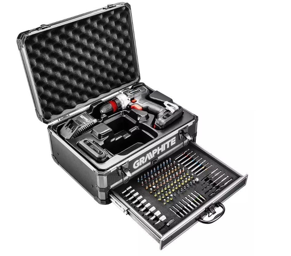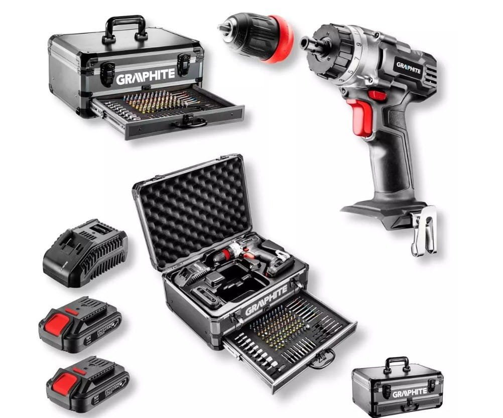 Zestaw Graphite Energy+ w walizce aluminiowej: wiertarko-wkrętarka z zdejmowanym uchwytem, 2 akumulatory 2.0Ah, ładowarka oraz 109 akcesoriów