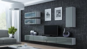 Dodatkowe informacje: Bezuchwytowe fronty, Szafka RTV VIGO '140': 30/140/40, podwieszana, dwie klapy otwierane do dołu, wewnątrz dwie komory., Witryna VIGO '90' szkło: 35/90/32, front w wysokim połysku przeszklony, możliwość wieszania w pionie lub poziomie., Opcjonalne oświetlenie LED półek (za dopłatą), Istnieje możliwość dokupienia oświetlenia szafkowego LED., Szafka podwieszana, Witryna VIGO '90' pełna: 35/90/32, front w wysokim połysku, możliwość wieszania w pionie lub poziomie., Dostępne kolory podświetlenia: biały zimny, czerwony, niebieski, zielony, Meble do samodzielnego montażu, Zdjęcia przedstawiają przykładową aranżację zestawu., Płyta wiórowa laminowana wyróżnia się odpornością na naprężenia mechaniczne i ekstremalne temperatury, Podany wymiar całkowity zestawu nie uwzględnia widocznych na zdjęciach przerw między bryłami. Zalecana odległość min. 10 cm.