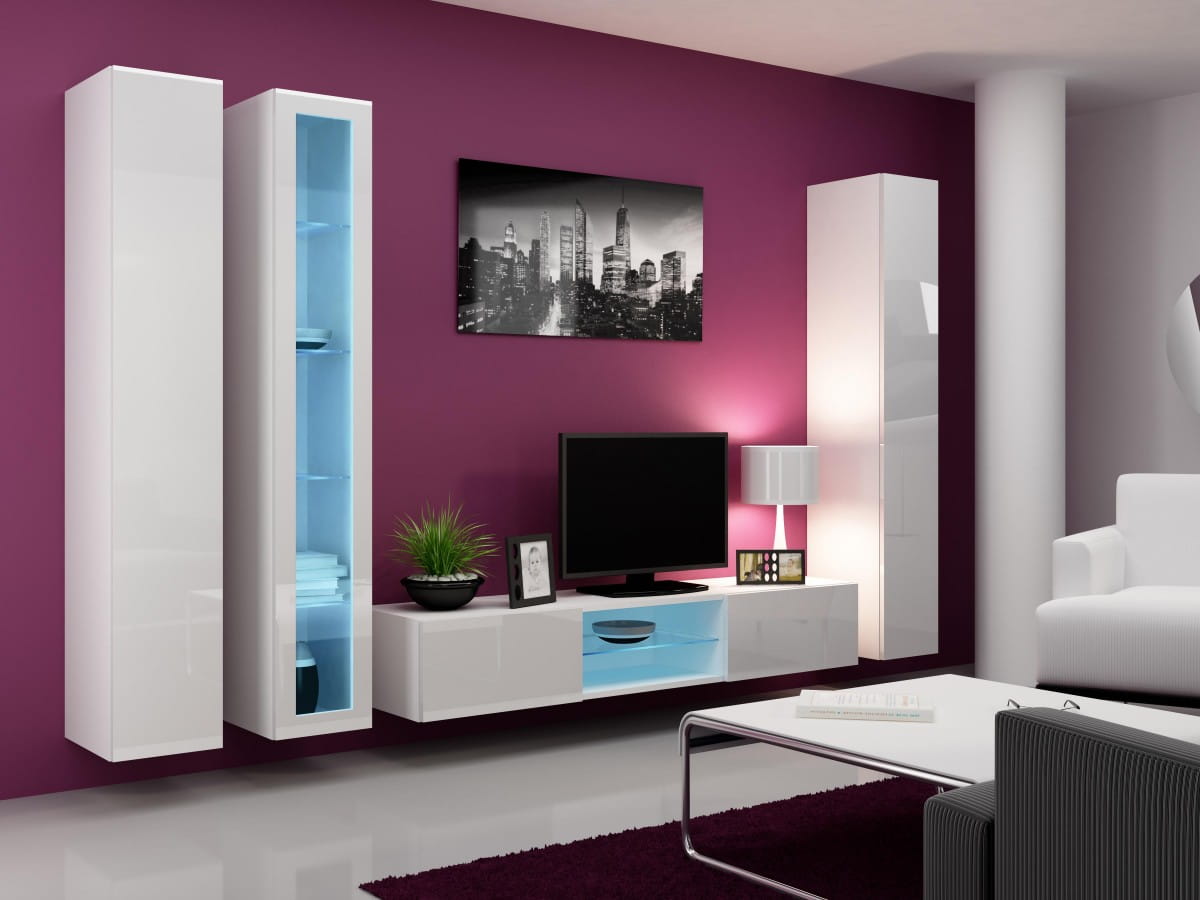Dodatkowe informacje: Meble do samodzielnego montażu, Szafka podwieszana, Witryna VIGO '180' szkło: 180/40/30, front w wysokim połysku przeszklony, wewnątrz cztery półki szklane., Szafka RTV VIGO GLASS: 30/180/40, z lewej i prawej strony klapy otwierane do dołu, fronty w wysokim połysku, komora otwarta z półką szklaną, szafka RTV podwieszana., Dostępne kolory podświetlenia: biały zimny, czerwony, niebieski, zielony, Bezuchwytowe fronty, Opcjonalne oświetlenie LED półek (za dopłatą), Istnieje możliwość dokupienia oświetlenia szafkowego LED., Witryna VIGO '180' pełna: 180/40/30, wewnątrz cztery półki zwykłe., Zdjęcia przedstawiają przykładową aranżację zestawu., Płyta wiórowa laminowana wyróżnia się odpornością na naprężenia mechaniczne i ekstremalne temperatury, Podany wymiar całkowity zestawu nie uwzględnia widocznych na zdjęciach przerw między bryłami. Zalecana odległość min. 10 cm.