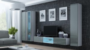 Dodatkowe informacje: Bezuchwytowe fronty, Opcjonalne oświetlenie LED półek (za dopłatą), Istnieje możliwość dokupienia oświetlenia szafkowego LED., Witryna VIGO '180' pełna: 180/40/30, wewnątrz cztery półki zwykłe., Zdjęcia przedstawiają przykładową aranżację zestawu., Witryna VIGO '180' szkło: 180/40/30, front w wysokim połysku przeszklony, wewnątrz cztery półki szklane., Szafka RTV VIGO GLASS: 30/180/40, z lewej i prawej strony klapy otwierane do dołu, fronty w wysokim połysku, komora otwarta z półką szklaną, szafka RTV podwieszana., Szafka podwieszana, Dostępne kolory podświetlenia: biały zimny, czerwony, niebieski, zielony, Płyta wiórowa laminowana wyróżnia się odpornością na naprężenia mechaniczne i ekstremalne temperatury, Meble do samodzielnego montażu, Podany wymiar całkowity zestawu nie uwzględnia widocznych na zdjęciach przerw między bryłami. Zalecana odległość min. 10 cm.