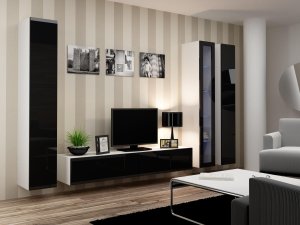 Dodatkowe informacje: Bezuchwytowe fronty, Szafka podwieszana, Meble do samodzielnego montażu, Istnieje możliwość dokupienia oświetlenia szafkowego LED., Opcjonalne oświetlenie LED półek (za dopłatą), Witryna VIGO '180' pełna: 180/40/30, wewnątrz cztery półki zwykłe., Zdjęcia przedstawiają przykładową aranżację zestawu., Dostępne kolory podświetlenia: biały zimny, czerwony, niebieski, zielony, Szafka RTV VIGO: 30/180/40, dwie klapy otwierane do dołu, front w wysokim połysku, wewnątrz dwie komory, szafka podwieszana., Płyta wiórowa laminowana wyróżnia się odpornością na naprężenia mechaniczne i ekstremalne temperatury, Witryna VIGO '180' szkło: 180/40/30, front w wysokim połysku przeszklony, wewnątrz cztery półki szklane., Podany wymiar całkowity zestawu nie uwzględnia widocznych na zdjęciach przerw między bryłami. Zalecana odległość min. 10 cm.