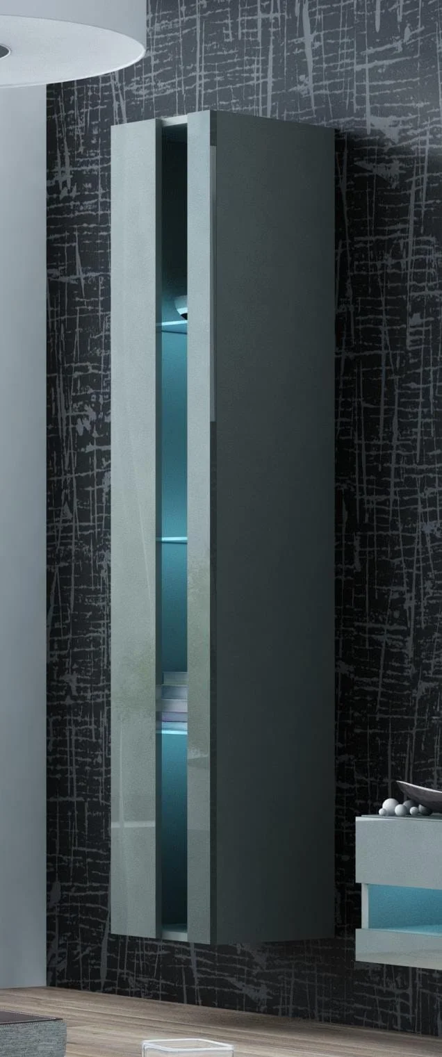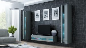 Dodatkowe informacje: Istnieje możliwość dokupienia oświetlenia szafkowego LED., Bezuchwytowe fronty, Opcjonalne oświetlenie LED półek (za dopłatą), Płyta wiórowa laminowana wyróżnia się odpornością na naprężenia mechaniczne i ekstremalne temperatury, Meble do samodzielnego montażu, Szafka podwieszana, Dostępne kolory podświetlenia: biały zimny, czerwony, niebieski, zielony, Szafka RTV VIGO NEW '140': 30/140/40, front otwarty (bez szyby) w wysokim połysku, jeden front stały (wysokość 7 cm), dwa fronty otwierane do góry (wysokość 14 cm), wewnątrz dwie komory, szafka RTV po, Zdjęcia przedstawiają przykładową aranżację zestawu., Witryna otwarta VIGO NEW: 180/40/30, front otwarty (bez szyby) w wysokim połysku, jeden front stały (węższy), jeden otwierany (szerszy), wewnątrz trzy półki szklane., Podany wymiar całkowity zestawu nie uwzględnia widocznych na zdjęciach przerw między bryłami. Zalecana odległość min. 10 cm.