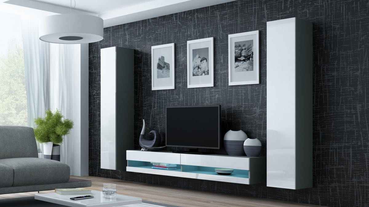 Dodatkowe informacje: Meble do samodzielnego montażu, Płyta wiórowa laminowana wyróżnia się odpornością na naprężenia mechaniczne i ekstremalne temperatury, Dostępne kolory podświetlenia: biały zimny, czerwony, niebieski, zielony, Podany wymiar całkowity zestawu nie uwzględnia widocznych na zdjęciach przerw między bryłami. Zalecana odległość min. 10 cm., Witryna VIGO '180' pełna: 180/40/30, wewnątrz cztery półki zwykłe., Zdjęcia przedstawiają przykładową aranżację zestawu., Istnieje możliwość dokupienia oświetlenia szafkowego LED., Bezuchwytowe fronty, Opcjonalne oświetlenie LED półek (za dopłatą), Szafka podwieszana, Szafka RTV VIGO NEW '180': 30/180/40, front otwarty (bez szyby) w wysokim połysku, jeden front stały (wysokość 7 cm), dwa fronty otwierane do góry (wysokość 14 cm), wewnątrz dwie komory, szafka RTV po