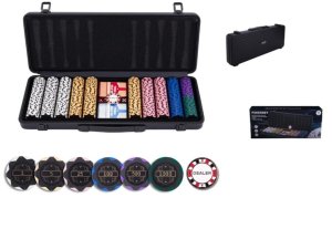Zestaw do pokera zawiera dwie talie kart, 500 żetonów (z wartością), 1 metalowy żeton rozdającego, pięć kości i czarne aluminiowe etui z zaokrąglonymi rogami. - 150 x 1 EUR - 150 x 5 EUR - 100 x 25 EUR - 50 x 100 EUR - 25 x 500 EUR - 25 x 1000 EUR