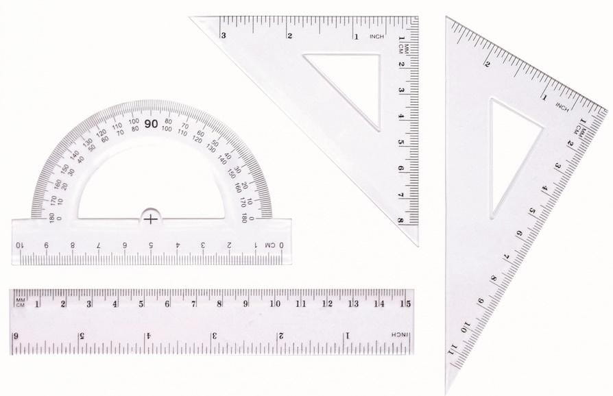 Zestaw wykonany z przeźroczystego trwałego tworzywa. Komplet zawiera: 2 ekierki, linijkę, kątomierz.