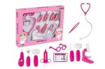 Zestaw lekarski różowy. W zestawie: stetoskop, pęseta, strzykawka, młoteczek, termometr, mikroskop, okulary, akcesoria lekarskie, plakietka lekarza.