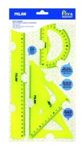 Zestaw geometryczny MILAN. Przezroczysty w kolorze neonowym żółtym. Linijka 30 cm, ekierka 30/60, ekierka 45/45, kątomierz. Wykonana z elastycznego i trwałego materiału (Flex&Resistant), co utrudnia jej złamanie. Skośna krawędź zapobiega zabrudzeniom.